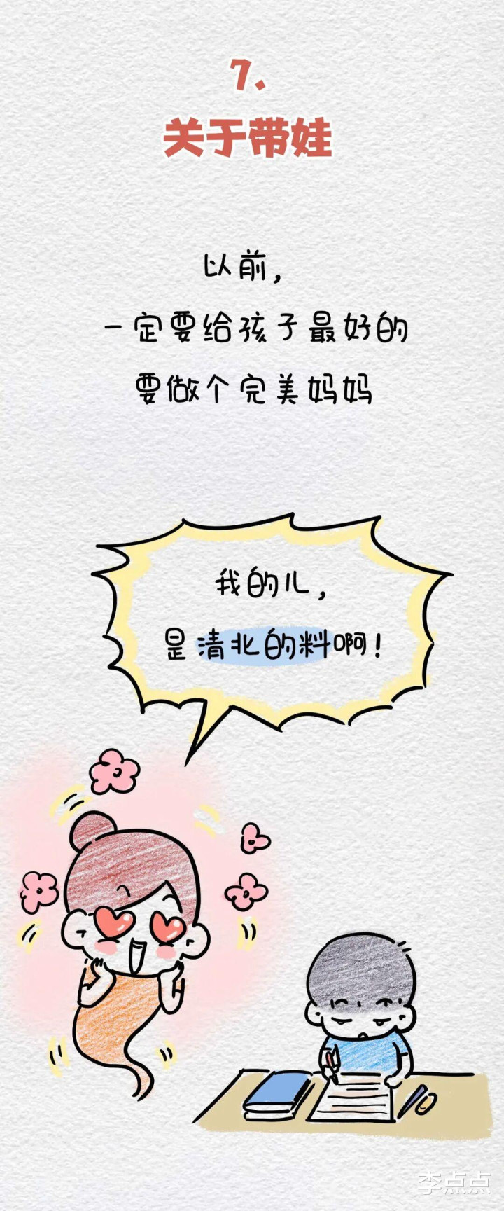 我是李点点,绘本漫画家,用漫画记录二胎生活中鸡飞狗跳的日常,画风幽默风趣。老大12岁在上小学五年级,老二8岁在上二年级,已出版绘本《萌宝土豆在德国》《世界上最好的家,就是爸爸爱妈妈》《五分钟创意简笔画》。